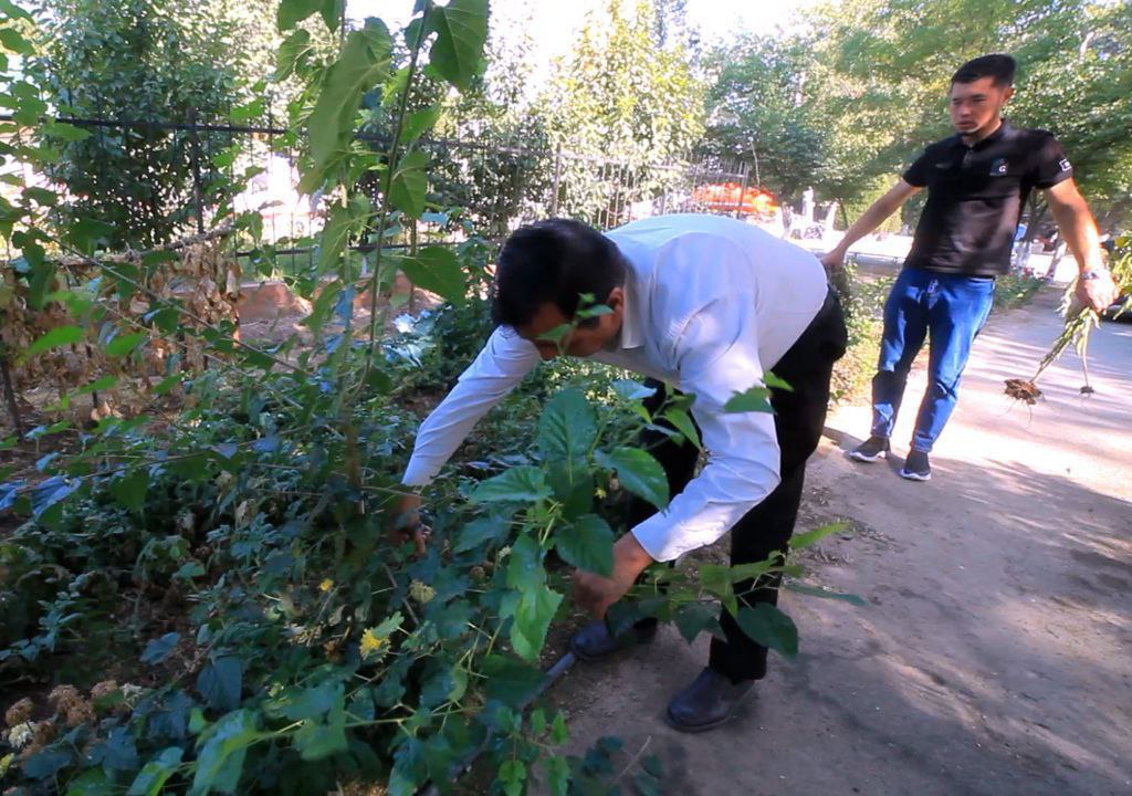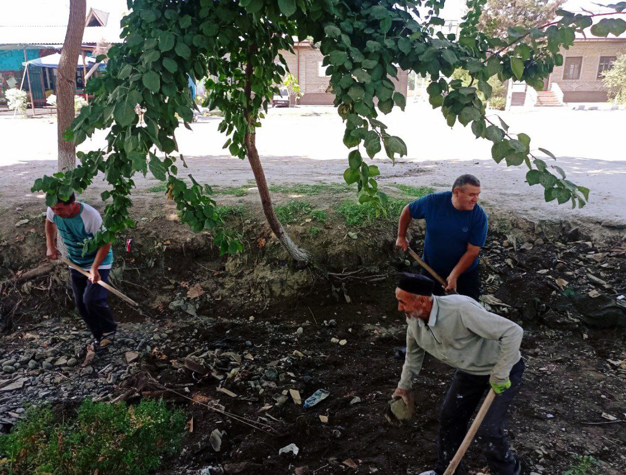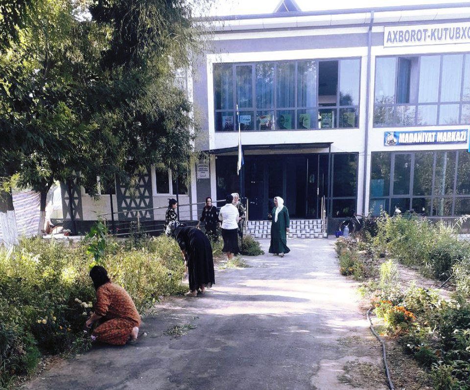 Tuman madaniyat bo‘limi xodimlari xam faol ishtirok etishmoqda. Daraxtlar oqlanib, gullar begona utilardan, chiqindilardan tozalanib,yashil hudud uchun joy hozirlanmoqda.