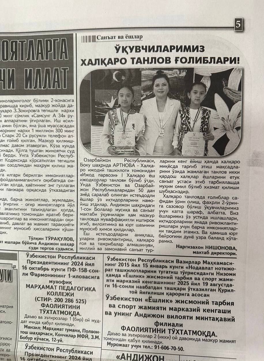 Andijon shahar 1-son bolalar musiqa va san’at maktabi o‘quvchilari: