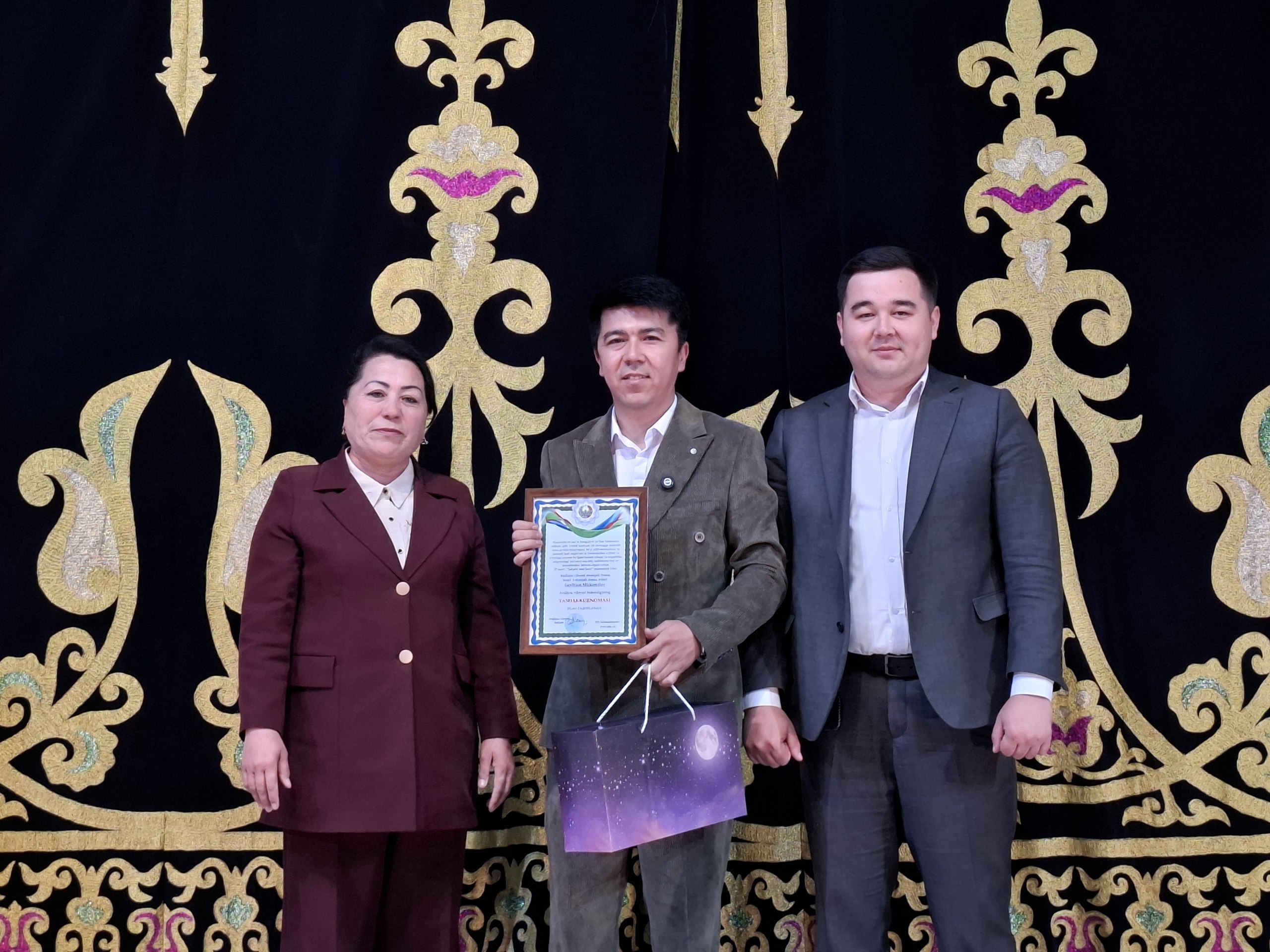 Andijon viloyati Madaniyat boshqarmasi boshlig‘i M. Sattarova hamda Madaniyat, sport va turizm xodimlari kasaba uyushmasi Andijon viloyat Kengashi raisi M.Kayumov tomonidan 27 mart — “Xalqaro teatr kuni” munosabati bilan bir guruh yoshlar taqdirlandi.